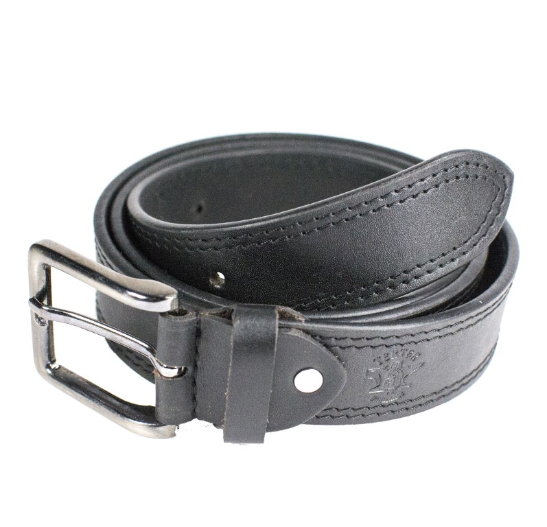 Мъжки колан online: Мъжки колан с двоен шев от качествена дебела телешка кожа с черен цвят и метална катарама подходящ за панталони и дънки.